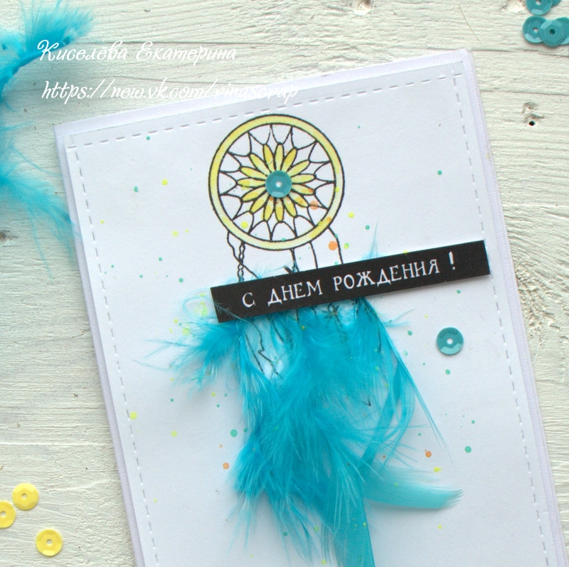 Место приклеивания перьев, прикрыла надписью ( ее я сделала на компьютере и распечатала). Добавила две пайетки